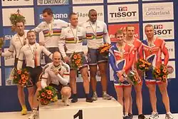 Podium van de teamsprint bij de mannen tijdens het WK van 2011 in Apeldoorn