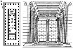 - De drie Griekse bouwstijlen worden in de architectuur verenigd, de Dorische orde aan de buitenkant en de Ionische en Korinthische orde [a] voor de binneninrichting.