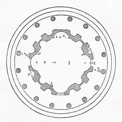 Tussen de cella en de koepel bindt zich een tussenstuk, een tamboer. Dit is ook een nieuw element voor de peripteros-vorm. De lijnen van de zuilen worden hierin voortgezet door pilasters, dunne rechthoekige ‘uitsteeksels’ in de muren. Ook in de tamboer zitten schelpvormige en rechthoekige nissen. Boven de zuilen bevindt zich een balustrade.