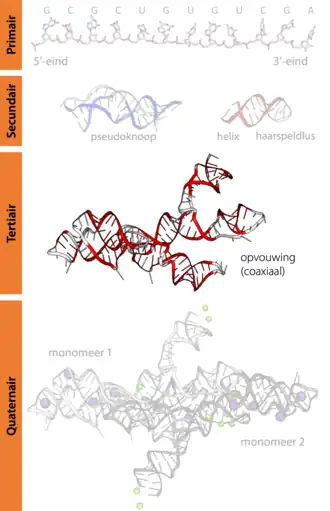 Een van de belangrijkste tertiaire structuren in RNA-moleculen is een opstelling die bekendstaat als coaxiale stapeling (Engels: coaxial stacking). Hierbij vormen twee helices via onderlinge interacties in wezen één continue helix. Deze conformatie, waarin het basenpaar aan het einde van de ene helix zich verbindt met het basenpaar aan het begin van de andere helix, wordt gestabiliseerd door stacking-interacties. Coaxiale stapeling is een belangrijk kenmerk van de algehele tertiaire structuur van RNA.[5]