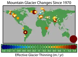 Herhaalde diktemetingen van 67 gletsjers geven een versnelde afname van de dikte te zien als de periode 1950 tot 1995 vergeleken wordt met 1995 tot 2001: respectievelijk 0,70 en 1,80 meter per jaar.[47] De gletsjers worden dus niet alleen korter maar ook dunner.