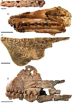 De symfyse van de onderkaken is overdwars zeer dun, bovenop slechts 16,6 millimeter ter hoogte van het eerste tandenpaar, naar achteren versmallend naar 12,3 millimeter ter hoogte van het vierde tandenpaar en 8,2 millimeter tussen het vijfde tandenpaar. Dit zou de werkelijke toestand vertegenwoordigen en niet het gevolg zijn van compressie van het fossiel. Het achterdeel van de kaken heeft een rechte bovenrand maar voor het vijfde paar steekt die rand schuin omhoog onder een hoek van 20°. Het stuk voor het tweede paar toont daarbij nog een lichte bolling.