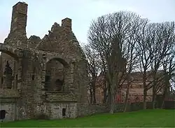 The Earl's Palace, met aan de linkerzijde de vierkante toren en centraal de vleugel met de grote hal. | ||