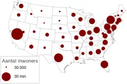 In de voorbeeldkaart is het thema de inwoners van VS. De stippenkaart geeft veel details, is zuiver, maar geeft het verschijnsel niet geclassificeerd weer.
