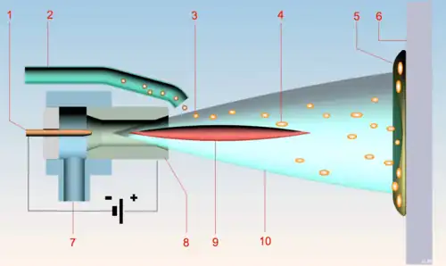 - Plasmaspuiten (verhitting door boog, met gasinjectie):