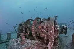 De Thistlegorm met onderdelen van een locomotief | ||||