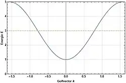 In Figuur 2 is de grafische weergave van bovenstaand resultaat te zien op het domein van de eerste Brillouinzone. Voor de constanten zijn de volgende waarden ingevuld: (weergegeven als de gouden stippellijn), en (waardoor de grenzen van de Brillouinzone hier dus zijn). Deze gekozen constanten zijn volstrekt arbitrair, maar dienen louter om een overzichtelijke grafische weergave te genereren. De breedte van de curve is nu namelijk duidelijk rondom de evenwichtstoestand en immer positief, zoals men verwacht. Bovendien levert elke golfvector precies een energie eigentoestand op: dit wordt een energieband genoemd.