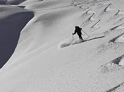 De afdalingen gebeuren op tourski's. Afhankelijk van de moeilijkheidsgraad van een afdaling kunnen hindernissen, zoals een rotsbarrière van 50 meter hoog, een continue afdaling onmogelijk maken. Deze hindernissen worden afgeklommen, met de ski's op de rugzak bevestigd, of er wordt een touw uit de rugzak gehaald om hiermee af te dalen.