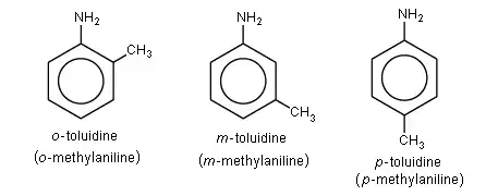 Toluïdine of methylaniline is een mengsel van drie isomere verbindingen, o-toluïdine, m-toluïdine en p-toluïdine, waarbij o- staat voor ortho-, m- voor meta- en p- voor para.