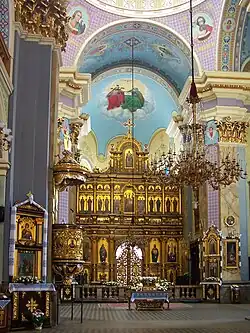 De Grieks-katholieke kerk liet uit de ruïnes de kerk herbouwen. Het oorspronkelijke ontwerp bleef bewaard, maar er werden een apsis aan het het korte koor en koepels op de beide kerktorens toegevoegd. Om het gebouw geschikt te maken voor de oosterse liturgie onderging het interieur grotere veranderingen.