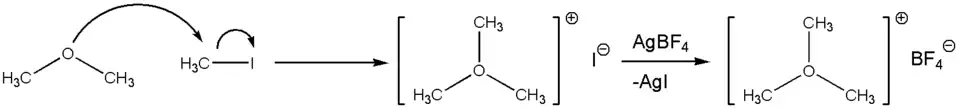 De reactie van dimethylether met methyljodide levert de oxoniumverbinding trimethyloxoniumjodide. Dit wordt in situ met zilvertetrafluorboraat omgezet in trimethyloxoniumtetrafluorboraat:[2]