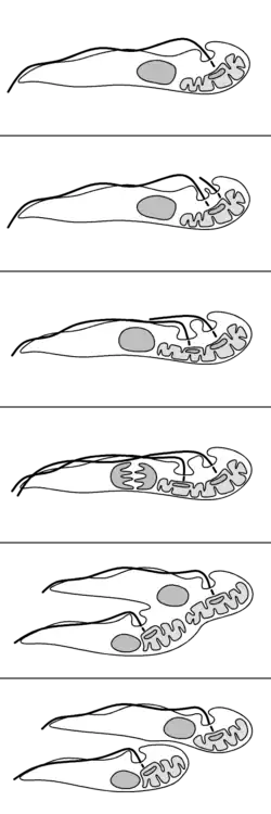 - Het basaallichaam verdubbelt en blijft verbonden met de kinetoplast. Elk basaallichaam vorm afzonderlijk een flagel.