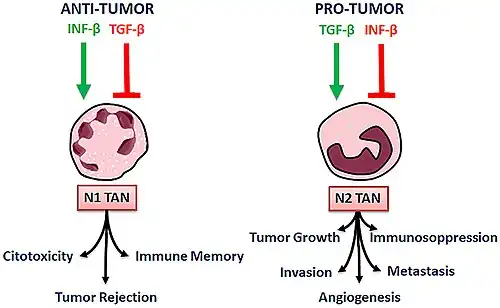 Wanneer TGF-β-activiteit wordt geblokkeerd, worden N1-TAN's cytotoxisch voor tumorcellen en activeren ze cytotoxische T-cellen, terwijl N2-TAN's dominant zijn in de controlegroep. TGF-β bevordert op zichzelf het pro-tumorigene N2-fenotype in TAN's bij muizen. Naast TGF-β wordt de polarisatie van TAN's ook bevorderd door de cytokines IFN-β. IFN-β stimuleert N1- en remt de N2-polarisatie, terwijl TGF-β juist N2 stimuleert en de fenotypische N1-polarisatie remt. Door TGF-β te blokkeren, wordt een significante vertraging van de tumorgroei bereikt via vele mechanismen, waaronder de activering van cytotoxische T-cellen en macrofagen.