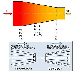 Bij het expansieproces daalt de druk van het stromende hete gas, terwijl de snelheid toeneemt. Het omzetten van druk in snelheid gebeurt in een straalbuis, dat is een convergerend (= toelopend) kanaal. Het principe van de straalbuis berust op de wet van Bernoulli die stelt dat: