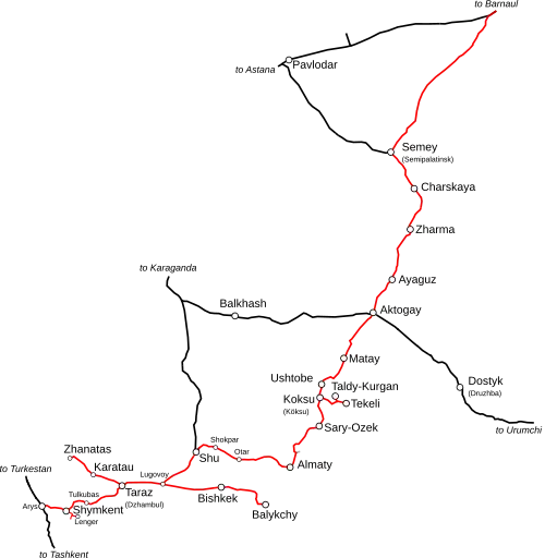 De spoorlijn start ten noordwesten van de Oezbeekse hoofdstad Tasjkent bij Arys, waar deze aftakt van de Trans-Kaspische spoorlijn. Van daaruit loopt de lijn grofweg naar het noordwesten door Şımkent, Taraz, Bisjkek naar de voormalige Kazachse hoofdstad Almaty. Vandaar voert de lijn verder naar het noorden door Semey naar de Russische grens. In Rusland loopt de spoorlijn door de stad Barnaoel en eindigt in Novosibirsk, waar ze aansluit op de Trans-Siberische spoorlijn.