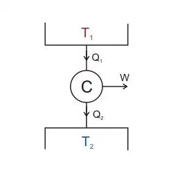 Schema voor een warmtemachine: warmte stroomt van reservoir 1 met temperatuur naar het koudere reservoir 2 met temperatuur , en een warmtemotor kan hiermee arbeid leveren.