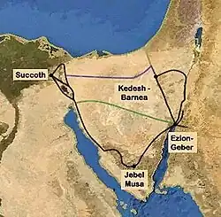 De Thora somt de rustplaatsen van de Israëlieten op. Sommige namen uit het begin van de zwerftocht, bijvoorbeeld Ra'amses, Pithom en Sukkot, kan men goed plaatsen op de oostelijke oever van de Nijl, en Kadesh Barnea, waar de Israëlieten 38 jaar zouden hebben verbleven, nadat ze terugkeerden van Kanaän. Voor de doortocht door de Rode Zee worden meerdere plaatsen aangewezen aan de Pelusische tak van de Nijl, langs de Bittermeren, en de kleinere kanalen die een barrière vormden tegen de oostelijke ontsnappingsweg, de Golf van Suez en de Golf van Akaba, of zelfs een lagune aan de Middellandse Zeekust.