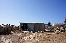 Umm al-Kheir, 2012. De ijzeren keet waarin een vrouw met haar 9 kinderen leeft, nadat haar huisje door Israëlische troepen gesloopt is. Op de achtergrond de Israëlische nederzetting Carmel