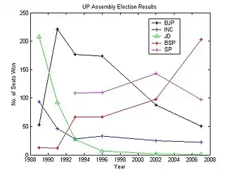Bij de parlementsverkiezingen van 2007 behaalde de Bahujan Samajpartij een verrassende[6] meerderheid in het parlement, waarmee hun belangrijkste rivaal, de Samajwadi-partij, ruim werd verslagen. De BSP kon hierdoor alleen een regering vormen waarbij Mayawati, een politica van dalit-afkomst, de chief minister werd. Vijf jaar later, in 2012, keerden de rollen echter om: de BSP viel ver terug, terwijl de SP een klinkende overwinning boekte. Akhilesh Yadav (SP) volgde Mayawati op als regeringsleider en bleef dit tot 2017. In dat jaar won de Bharatiya Janata-partij de verkiezingen met een overweldigende meerderheid van 312 zetels. De nieuwe chief minister werd BJP-leider Yogi Adityanath.