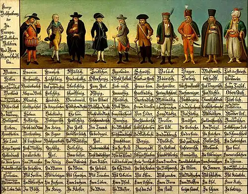 Boven het schilderij staat in het (oud-) Duits waartoe het schilderij dient, namelijk de beschrijving van de volkeren en hun eigenschappen: "Kurze Beschreibung der In Europa Befintlichen Völckern Und Ihren Aigenschafften". Onder de afbeeldingen van de volkeren staat hun naam vermeld en daaronder verticaal hun eigenschappen zoals in onderstaand schema. In het 18e-eeuwse Duits luiden de namen van de volkeren respectievelijk: "Spanier", "Frantzoß", "Wælisch", "Teutscher", "Engerländer", "Schwœth", "Boläck", "Unger", "Muskawith" en "Tirk oder Griech", er is dus sprake van een opsomming van west naar oost op de landkaart gezien, al klopt 'de Engelsman' daar dan geografisch gezien niet.
