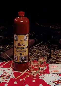 Een typerende kruik (of stoop) Faluintjesjenever van uit 1986. Centraal onderaan het etiket is nog de oude stempel van VdS te zien dat ook als logo gebruikt werd.
