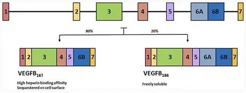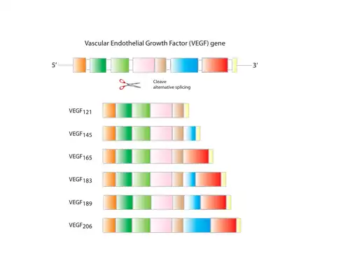 Er zijn meerdere isovormen van VEGF-A die het resultaat zijn van alternatieve splicing van mRNA van een enkel VEGFA-gen van 8 exonen. Deze worden ingedeeld in twee groepen die worden aangeduid op basis van hun terminale exon (exon 8) splice-site: de proximale splice-site (aangeduid als VEGFxxx) of distale splice-site (VEGFxxxb). Bovendien verandert alternatieve splicing van exon 6 en 7 hun heparine-bindende affiniteit en aminozuurnummer (bij mensen: VEGF121, VEGF121b, VEGF145, VEGF165, VEGF165b, VEGF189, VEGF206; de knaagdierorthologen van deze eiwitten bevatten één aminozuur minder). Deze domeinen hebben belangrijke functionele consequenties voor de VEGF-splicevarianten, aangezien de terminale (exon 8) spliceplaats bepaalt of de eiwitten pro-angiogeen (proximale spliceplaats, tot expressie gebracht tijdens angiogenese) of anti-angiogeen (distale spliceplaats, tot expressie gebracht in normale weefsels) zijn. Bovendien bemiddelen inclusie of exclusie van exonen 6 en 7 interacties met heparansulfaatproteoglycanen (HSPG's) en neuropiline-coreceptoren op het celoppervlak, waardoor hun vermogen om de VEGF-receptoren (VEGFR's) te binden en te activeren wordt verbeterd.[20] Onlangs is aangetoond dat VEGF-C een belangrijke inductor is van neurogenese in de subventriculaire zone van muizen, zonder angiogene effecten uit te oefenen.[21]