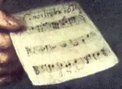Detail uit Hausmanns Bach-portret. Hierop ziet men in de hand, een vel papier waarop de 13e canon genoteerd staat.