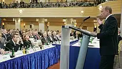 Tijdens de veiligheidsconferentie van München op 10 februari 2007 hield de Russische president, Vladimir Poetin, een toespraak. De speech bracht belangrijke punten tot uitdrukking van de toekomstige politiek van Rusland, gedreven door Poetin.[13] Poetin bekritiseerde wat hij de 'monopolistische dominantie' van de Verenigde Staten in mondiale betrekkingen noemde,[14] en het 'bijna ongebreidelde hypergebruik van geweld in internationale betrekkingen'.[15] Poetins toespraak werd, vooral in Rusland, bekend als de toespraak in München. Hij zei dat het resultaat van een dergelijke dominantie was dat niemand zich veilig voelde,[16] 'omdat niemand kan voelen dat het internationale recht als een stenen muur is die hen zal beschermen. Natuurlijk stimuleert zo'n beleid een wapenwedloop'.[17]