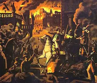 Napoleon was na een tocht van 82 dagen over 800 kilometer op 14 september met zijn troepen Moskou binnengetrokken. Hij kwam daar in een vrijwel lege stad die op bevel van haar gouverneur Fjodor Rostoptsjin was ontdaan van een groot deel van haar voorraden. Vrijwel de hele bevolking had Moskou verlaten. De keizer had inmiddels nog slechts een kwart van zijn troepen over, zonder dat hij de Russen een beslissende slag had weten toe te brengen. Napoleon, die zijn intrek nam in het Kremlin, hoopte dat na de verovering van de tweede stad van het land (Sint-Petersburg was de eerste) tsaar Alexander zou capituleren. Dat gebeurde echter niet. In plaats daarvan braken er in Moskou overal branden uit, aanvankelijk het gevolg van onvoorzichtig gedrag van zijn eigen troepen, maar daarna bewust aangestoken door Russische saboteurs in opdracht van de gouverneur. Zij hoefden niet veel moeite te doen, want ongeveer tachtig procent van alle huizen in de stad was van hout. Rostoptsjin had ook bevel gegeven alle bluspompen en de mannen die ze moesten bedienen te evacueren.