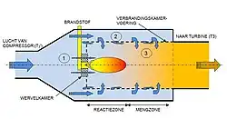 Alle lucht komt uiteindelijk aan de binnenkant van de voering en wordt door de vlam verhit. Rond de verstuivers zorgen wervelkamers voor een wervelende luchtstroom, waarin de brandstof goed met lucht gemengd wordt. Bij het starten van de gasturbine wordt de brandstof door een vonkende bougie ("igniter") ontstoken. Daarna is de verbranding continu en de bougie wordt uitgeschakeld. Bij sommige gasturbines wordt de aanwezigheid van de vlam bewaakt met een of meer vlambewakers ("flame detectors").