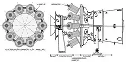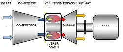 De verbrandingskamer van een gasturbine dient voor het verhitten van de lucht van hoge druk, die door de compressor is aangevoerd. De hete gassen uit de verbrandingskamer gaan naar de turbine.