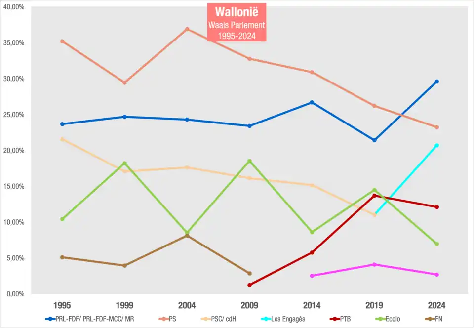 Evolutie verkiezingsuitslagen Waals Parlement (1995-2024)