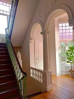 De ruimtes aan de straatzijde bestaan uit salons, eetruimte en een fumoir, met parketvloeren en een rijkelijk gedecoreerd plafond. De originele open haard in de salon en eetkamer is behouden. De fumoir is gedecoreerd met art-nouveau-ornamenten en Moorse schilderingen, met een veelkleurige glazen koepel als hoogtepunt. Een bureauruimte op parket bevindt zich op de hoek tussen de inkomhal en de salon. Aan de tuinzijde bevindt zich de keuken, met een mozaïekvloer in klassieke uitvoering.