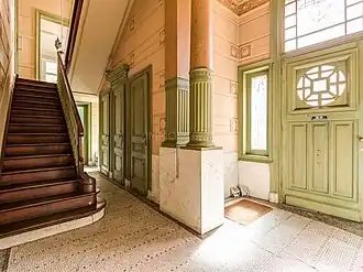 Het inventieve grondplan van de woning omvat circulatieruimtes die strategisch aan de straatzijde zijn geplaatst om daglicht in de woning te brengen. De inkomhal is versierd met art-nouveaumotieven op mozaïek, marmeren lambrisering en geprofileerd stucwerk. De voordeur, omgeven door glas-in-loodramen, wordt geflankeerd door kolommen en pilasters. De traphal, in dezelfde stijl, leidt naar bergingen en de keuken, waar daglicht wordt binnengelaten via de gevel.
