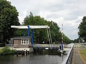 | Voorbeeld van een constructie met een vierstangenmechanisme met twee overeenkomstige ophaalbruggen, links in gesloten stand, rechts in open stand ter illustratie van de beweging. De verticale pilaren ("vaste stang1") dragen een scharnierende bovenbouw ("stang2") met het contragewicht aan de linkerkant en verticale scharnierende stangen ("stang3") aan de rechterkant welke onderaan scharnierend zijn verbonden aan het brugdek ("stang4"). | |