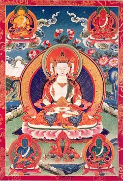 - de zes Gezegenden of Boeddha's van de 'zes rijken van de wereld' (6): Indra van de honderd offergaven, de wijze van de goden; Vemachitra (het Prachtige Gewaad), de wijze van de jaloerse goden (asura's); de Leeuw van de Shakya's, de wijze van de mensen; Dhruvasinha (de Standvastige Leeuw), de wijze van de dieren; Jvalamukha (de Vlammende Muil), de wijze van de hongerige geesten; Dharmaraja (de Dharma-koning), de wijze van de hellewezens.