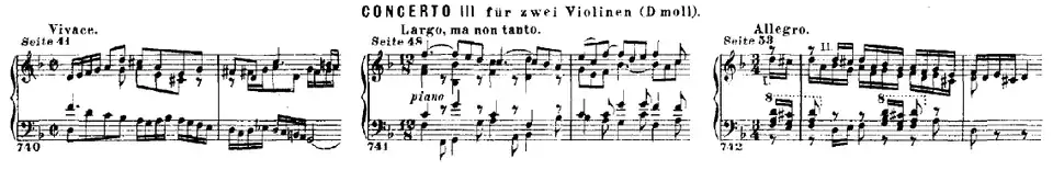 - BWV 1064: Concert voor drie violen en orkest in D majeur, een adaptatie van het tripelconcert voor drie klavecimbels en orkest in C majeur. Hoewel de versie voor drie violen ook op speculatie berust, is deze reconstructie minder omstreden dan bij BWV 1063.