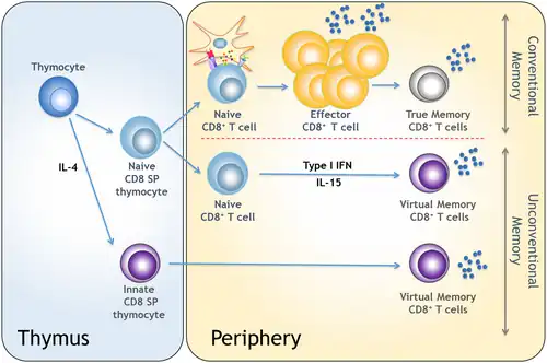 - ↑ Lee JY, Hamilton SE, Akue AD, Hogquist KA, Jameson SC (August 2013). Virtual memory CD8 T cells display unique functional properties. Proceedings of the National Academy of Sciences of the United States of America 110 (33): 13498–503. PMID 23898211. PMC 3746847. DOI: 10.1073/pnas.1307572110.