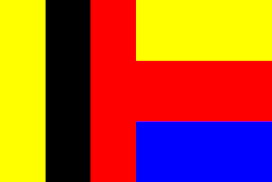 Links, drie verticale banen van geel-zwart-rood en rechts, drie horizontale banen van geel-rood-blauw