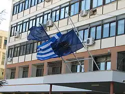 Wapperende Europese, Griekse en Grieks-Macedonische vlaggen, Kozani-departementsgebouw