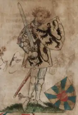 Dit klopt echter niet.[11] In 1162 had graaf Filips van de Elzas al een leeuw (of "moedig dier") op zijn zegelring, en werd hij er op zijn helm, schild en banier mee afgebeeld. Hij vertrok echter pas in 1177 op kruistocht (en niet tegen Baibars, die pas in 1223 geboren werd).