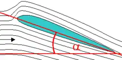 De pijl geeft de richting van de luchtstroom aan. De hoek α is de invalshoek