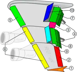 7. Drievoudig uitschuifbare binnenste welvingsklep (Engels: (trailing-edge) flap) zowel de binnenste als de buitenste flap dienen om voldoende lift te genereren bij lage snelheden