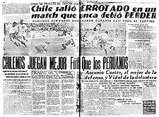 ↑De kop luidt "Chile salio DERROTADO en un match que nunca debio PERDER" ("Chili werd verslagen in een wedstrijd, die het nooit had moeten verliezen"). Gerefereerd wordt naar het met 1–0 verloren duel op 26 januari 1935, dat gespeeld werd op het Zuid-Amerikaans voetbalkampioenschap 1935.