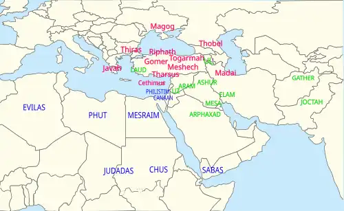 - Zonen van Sem: Elam, Assur, Arpachsad, Lud en Aram.