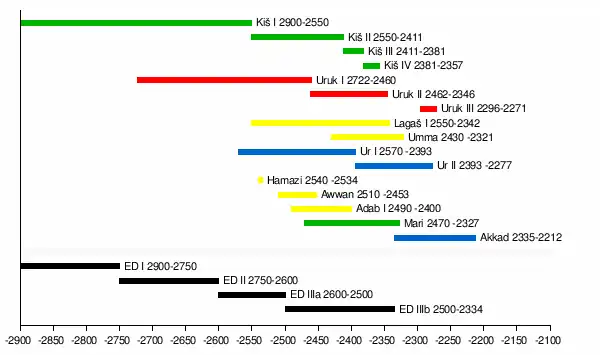 - Dit artikel of een eerdere versie ervan is een (gedeeltelijke) vertaling van het artikel Early Dynastic Period (Mesopotamia) op de Engelstalige Wikipedia, dat onder de licentie Creative Commons Naamsvermelding/Gelijk delen valt. Zie de bewerkingsgeschiedenis aldaar.