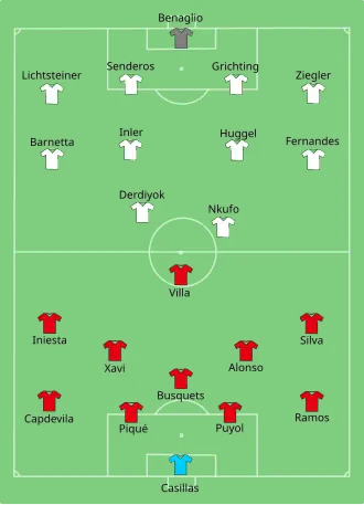 | Iker Casillas Sergio Ramos Carles Puyol Gerard Piqué Joan Capdevila Xabi Alonso Sergio Busquets Xavi Hernández David Silva Andrés Iniesta David Villa |