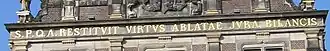 Op de oostelijke sierlijke voorgevel van de Waag staat de volgende spreuk in gouden letters: "SPQA (Senatus PopulusQue Alcmariensis) RESTITVIT VIRTVS ABLATAE JVRA BILANCIS" | "Moed en kracht schonken regering en burgerij van Alkmaar het verloren waagrecht weer". Deze spreuk herinnert aan het dappere en succesvolle verweer van de bevolking van Alkmaar tegen de Spanjaarden, tijdens het ontzet van 8 oktober 1573, ten gunste van de Prins van Oranje kreeg de burgerij van Alkmaar op 13 juli 1581 de Waag in volle eigendom terug.