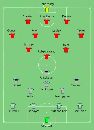 De Welshmen speelden in hun kwartfinale tegen België, dat de laatste acht bereikte ten koste van Hongarije. De Belgen maakten in de dertiende minuut 0-1. Nadat Eden Hazard, Axel Witsel en Radja Nainggolan de bal een aantal keer naar elkaar schoven op enige afstand van het Welshe strafschopgebied, legde Nainggolan aan voor een schot van ± 25 meter afstand. Daarmee passeerde hij zowel een groep medespelers en tegenstanders als doelman Hennessey, in de linkerbovenhoek. Net na het halfuur maakte Wales gelijk. Ramsey bracht een hoekschop van rechts hoog voor het Belgische doel, waarna Ashley Williams vanaf de rand van het doelgebied in de korte hoek kopte. De Welshmen kwamen tien minuten na rust ook op 2-1. Bale stuurde met een pass vanaf de middenlijn Ramsey weg op rechts, die vervolgens Robson-Kanu aanspeelde ter hoogte van de strafschopstip. Hij nam de bal aan, draaide in één beweging tussen Thomas Meunier en Marouane Fellaini door en werkte vervolgens vrij voor Thibaut Courtois af in de linkerhoek. Een paar minuten voor tijd kwam de eindstand op het bord: 3-1. Chris Gunter verstuurde een voorzet vanaf rechts voor het Belgische doel, waarna invaller Sam Vokes die ter hoogte van de eerste paal in de verre hoek kopte. Wales ging door naar de halve finales