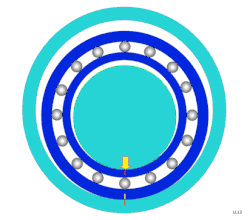 - Roterende belasting. Er is sprake van een roterende belasting als de ring roteert en de belasting stilstaat of als de ring stilstaat en de belasting roteert (zie de animatie). Gedurende een omwenteling wordt ieder punt van de loopbaan eenmaal belast. Bij een roterende belasting walst (kruipt) een lagerring wanneer deze met een losse passing is gemonteerd op zijn zitting. Na één omwenteling zal de lagerring, ten opzichte van het lagerhuis, het lengteverschil van de omtrekken verplaatsen. Zo zal bij een passingverschil van 1 µm (0,000.001 m) de verplaatsing 3,14 µm zijn. Deze minieme verplaatsing is er de oorzaak van dat het lager beschadigt. Ook ontstaat hierdoor passingroest. Door het toepassen van een voldoende vaste passing wordt dit voorkomen.